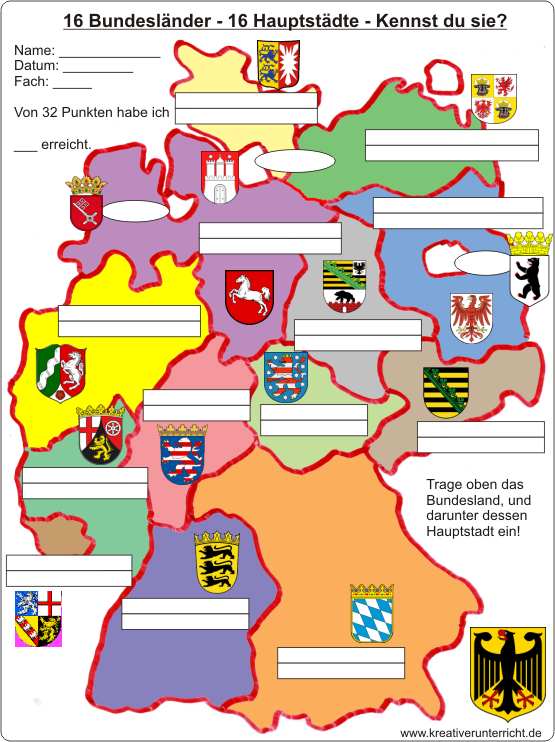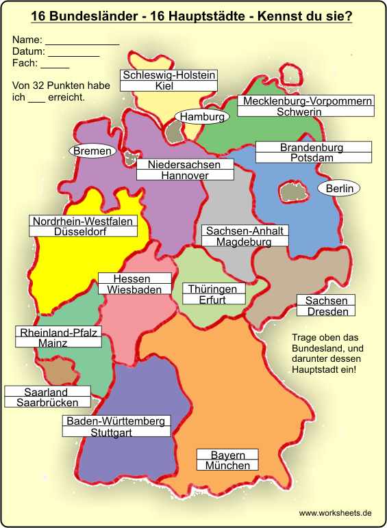 16 Bundesländer - 16 Hauptstädte Deutschlands mit den drei Stadtstaaten: Berlin, Bremen und Hamburg als Karte zum Eintragen der Namen - Arbeitsblatt und Lösungsfolie