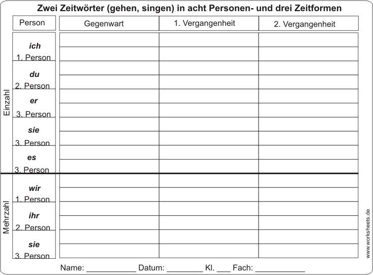 Zwei Zeitwörter (gehen, singen) in acht Personen- und drei Zeitformen