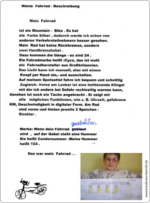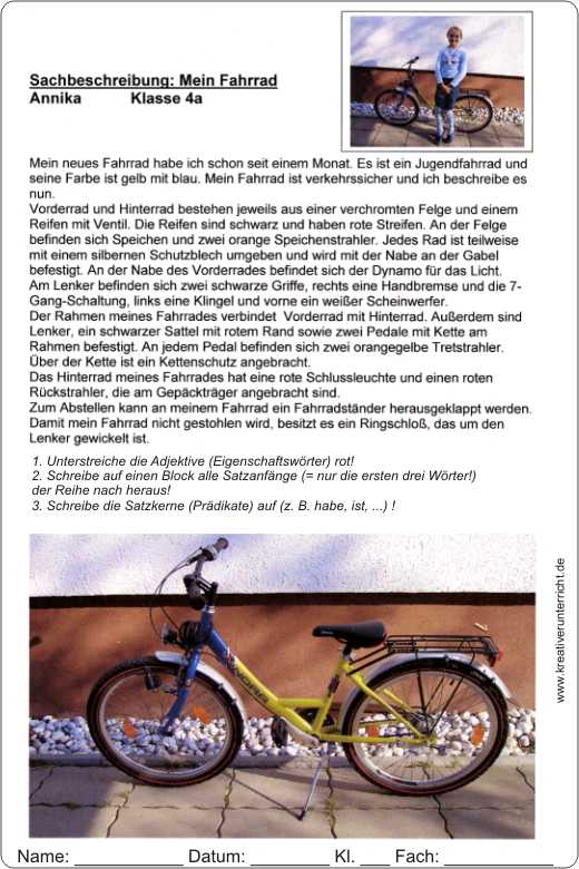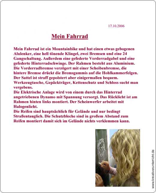 Mein Fahrrad - Annika und noch andere Schüler haben ihre Beschreibung mit dem Computer bearbeitet und ausgedruckt. Am Bild, das sie mit einer Digitalkamera aufgenommen hat, kann man die Beschreibung überprüfen. Eine tolle Sache!