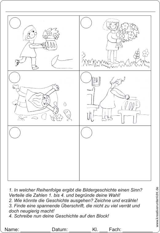 Bildergeschichte - Sinnvolle Reihenfolge, Ausgang der Geschichte und Überschrift finden.