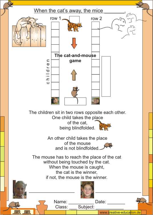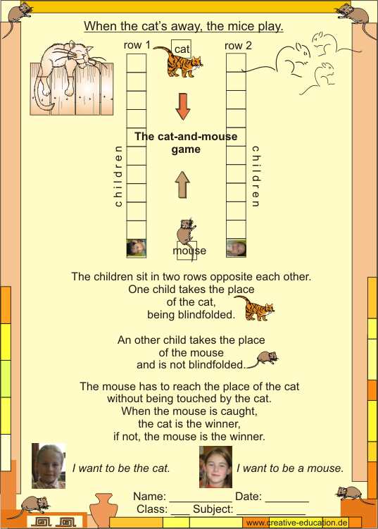 The children sit in two rows opposite each other with a space between. One child takes the place of the cat, being blindfolded. An other child takes the place of the mouse and is not blindfolded. The mouse has to reach the place of the cat without being touched by the cat and the other way round.