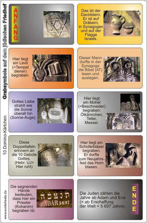 Der jüdische Friedhof in Bechhofen wurde etwa um 1300 n. Chr. (im Jahre 5060 nach jüd. Kalender) angelegt. Er hat eine Fläche von 2,0 ha und etwa 7500 bis 8000 Gräber mit sehr interessanten Symbolen auf den Grabsteinen. Das DOMINO-Arbeitsblatt zeigt etwas von der Fülle der Zeichen und Inschriften.
