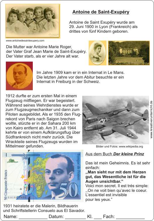 Lebenslauf von Antoine de Saint - Exupéry mit dem wichtigsten einfachen Geheimnis: “Man sieht nur mit dem Herzen gut, das Wesentliche ist für die Augen unsichtbar” aus dem Buch “Der kleine Prinz”