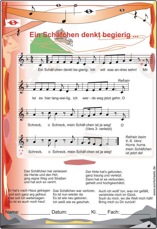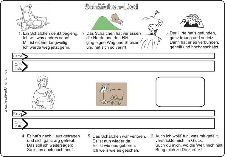 Ein Schäfchen denkt begierig - Ein Schäfchen war verloren: Eines der beliebtesten Spiellieder. Kurze Anleitung für je zwei Banknachbarn: Nach dem gesungenen Text “ich werde weg jetzt gehn” darf der eine Partner aufstehen und sich im Klassenzimmer verstecken. Der andere Partner legt seinen Kopf auf die Bank -er darf nichts sehen. Beim Anfang des dritten Verses darf er aufstehen und seinen Partner suchen. Dann trägt er sein “Schäfchen” zurück zur Bank. Am Ende des fünften Verses müssen alle wieder auf dem Platz sein. Beim zweiten mal Singen wechseln die Rollen.