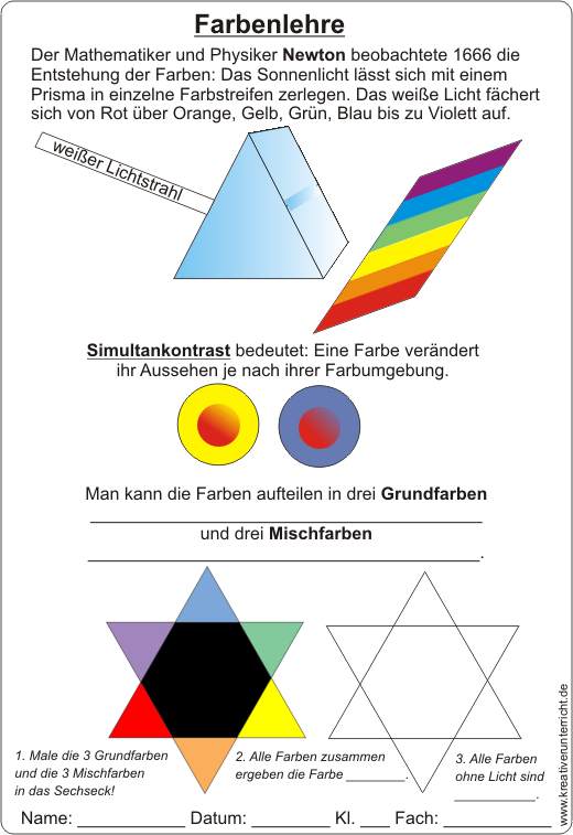 Farbenlehre - Grundfarben - Mischfarben - Simultankontrast - Farbzerlegung durch ein Prisma (Newton)
