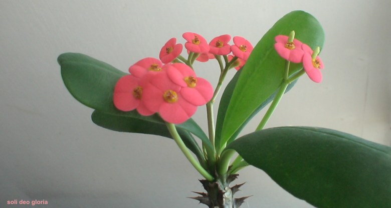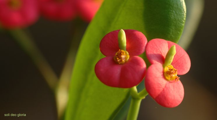 Mein Christusdorn blüht das ganze Jahr über und hat seit Jahren noch nie aufgehört zu blühen. Manchmal wächst aus einer Blüte eine zweite Blüte über der ersten Blüte. Siehe auch letztes Bild. Da beginnt sich eine zweite Blüte zu entwickeln.