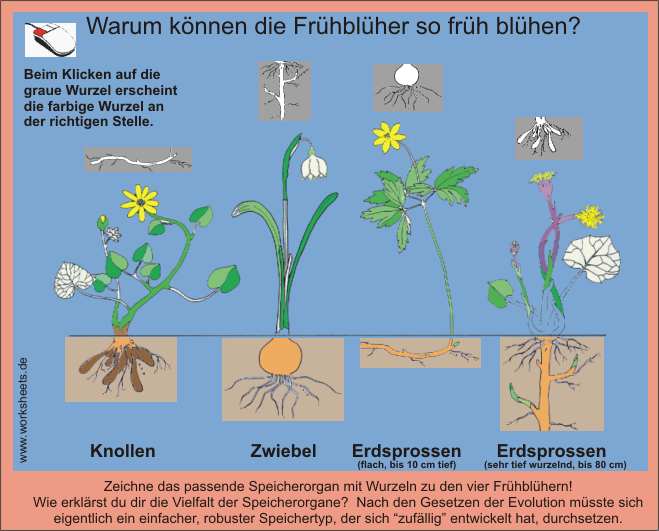 Hier ein Beispiel für die “Tausch-Methode” von LERNMEDIEN-DESIGN: Einmal muss man von den Speicherorganen auf die restliche Pflanze schließen und dann umgekehrt. Hier: Welche Frühlingsblumen gehören zu den Speicherorganen? Und: Warum können Frühblüher so früh blühen? Ergänze die Speicherorgane!