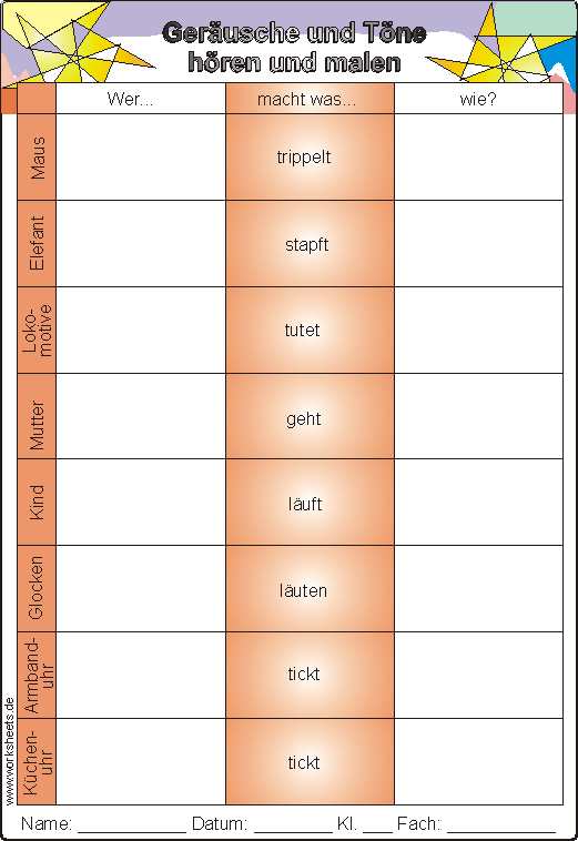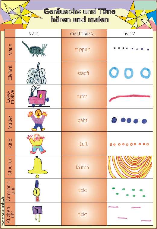 Geräusche und Töne hören und malen: Die Schüler dürfen verschiedene Geräusche aus der ihrer Erfahrungswelt vor der Klasse vormachen und an die Tafel ein passendes Zeichen dazu malen. In der Klasse ergibt sich viel Gesprächsstoff über die Merkmale von Tönen und deren Sichtbarmachen durch Zeichen. Zur Festigung kann nun das Arbeitsblatt eingesetzt werden.