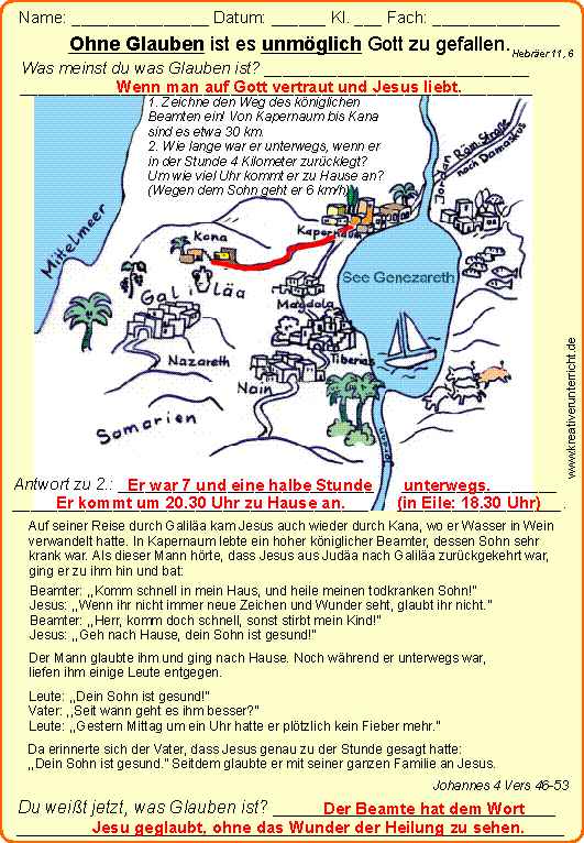 Ohne Glauben ist es unmöglich Gott zu gefallen. Glaubenohne das Wunder der Heilung zu sehen: Johannes 4, 46 -53. Arbeitsblatt mit Lösungsfolie