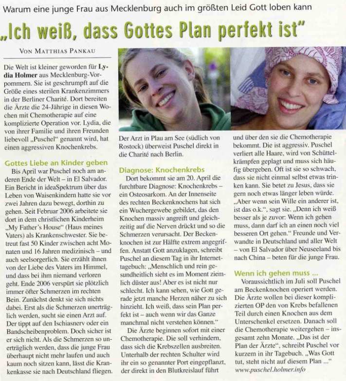 Für Blinde, die  geschriebenen Text von ihrer Software vorgelesen bekommen, ist hier eine kurze Einführung: Die Welt ist kleiner geworden für Lydia Holmer aus Mecklenburg-Vorpommern. Sie ist geschrumpft auf die Größe eines sterilen Krankenzimmers in der Berliner Charité. Dort bereiten die Ärzte die 24-Jährige in diesen Wochen mit Chemotherapie auf eine komplizierte Operation vor. Lydia, die von ihren Freunden liebevoll ,,Puschel” genannt wird, hat einen aggressiven Knochenkrebs.