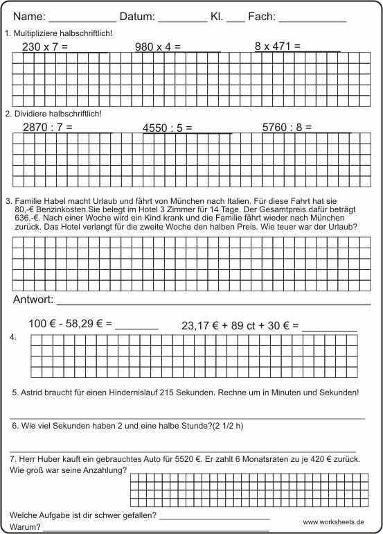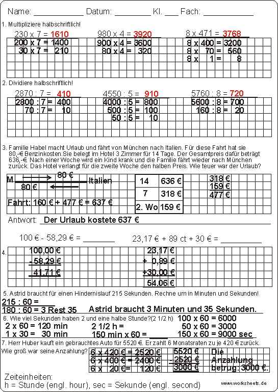 Übungsaufgaben zum Malnehmen, Teilen, Plus, Minus, Sachaufgaben mit Zeitbrechnungen und Ratenzahlung