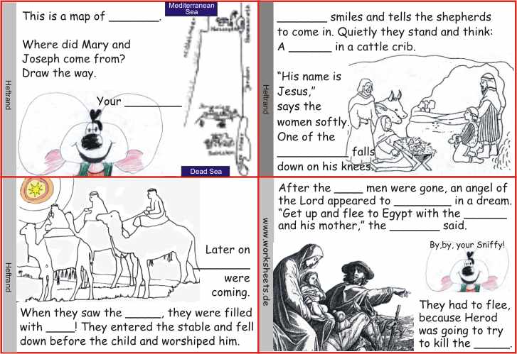 A small book for Christmas. Die Weihnachtsgeschichte wird von der Maus Sniffy (gemalt von Cordula Bogenreuther) erzählt. Im Klassengespräch werden die Lücken ausgefüllt und anschließend die Bilder farbig gestaltet. Alle acht Seiten werden ausgeschnitten und dann zu einem Heftchen zusammengeheftet (Heftrand!).