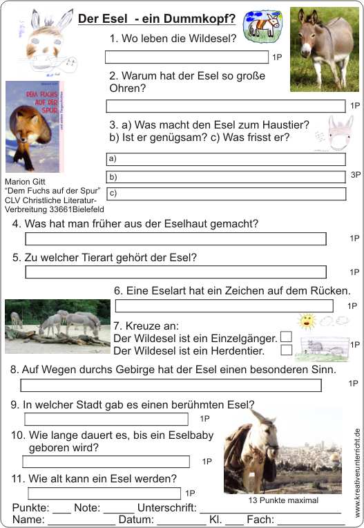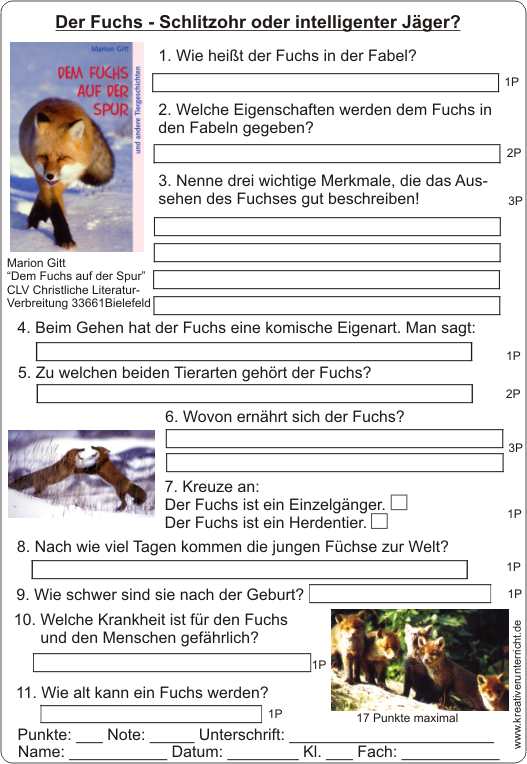 Klassenlektüre: Dem Fuchs auf der Spur und anderen Tiergeschichten” von Marion Gitt, erschienen im CLV-Verlag, 33661 Bielefeld. Es werden acht verschiedene Tiere mit ihren Besonderheiten vorgestellt. Die Tiergeschichten sind bestens geeignet für die dritte bis fünfte Klasse.