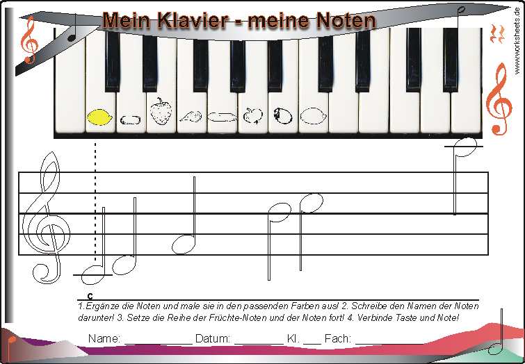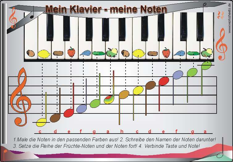 Mein Klavier - Meine Noten: Wenn sich die Früchte-Notennamen bei den Schülern eingeprägt haben, kann nun die Einführung der Norm-Notennotation beginnen. Der Vergleich mit den Früchten auf den Klaviertasten wird durch die Verbindungslinien noch einmal deutlich gemacht. Die Noten sollen eingezeichnet und zum hohen “a” ergänzt werden. Die Schüler merken, dass sich die Notennamen wiederholen. Die Noten erhalten noch die Farben der “Früchte-Noten”.