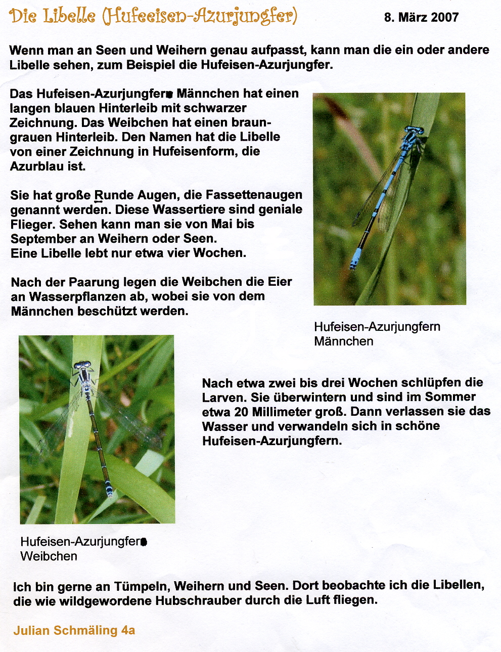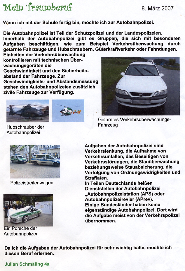 Julian hat zwei Traumberufe: Autobahnpolizist und Naturfreund. Diese zwei mit dem Computer ausgezeichnet gestaltete Referate hielt er vor der Klasse.