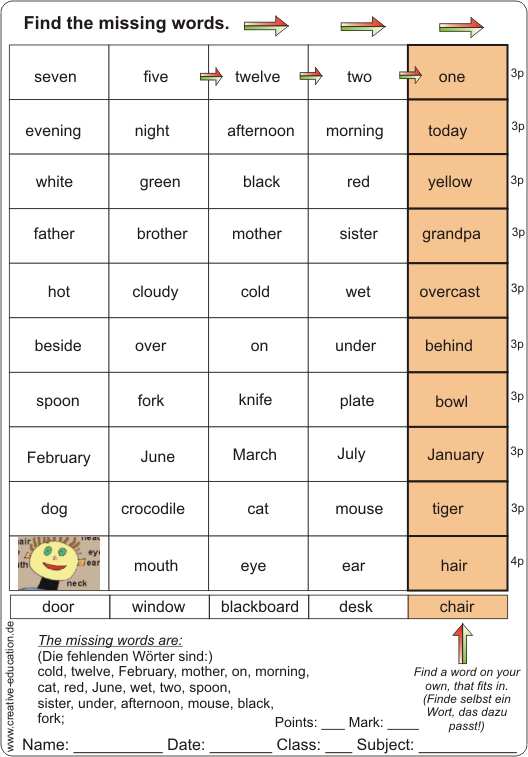 Search words referring to the terms such as numbers, times, colours, family, weather, prepositions, plants, vehicles, animals and parts of the body or things of the classroom.