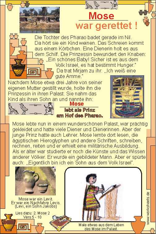 Mose lebt als Prinz am Hofe des Pharao - Arbeitsblatt und Lösungsblatt