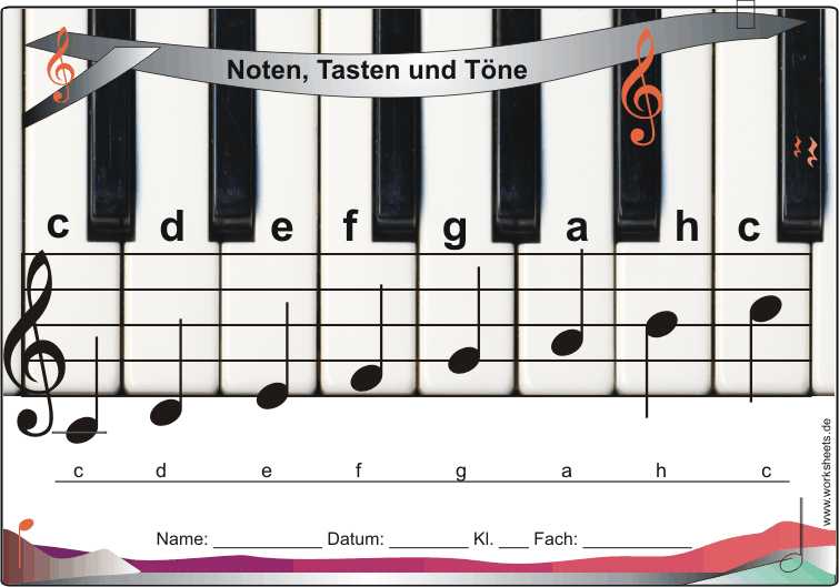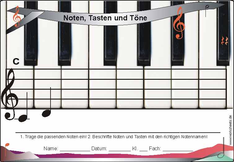 Noten, Tasten, Töne - Mit diesem Arbeitsblatt wird nochmals eine Entsprechung von Klaviertaste und Note auf der Notenlinie hergestellt. Durch diese variierten Darstellungen soll der Schüler ein kreatives und flexibles Notenverständnis bekommen, as stets mit einem Instrument verbunden ist. (Arbeitsblatt mit Lösungsfolie)
