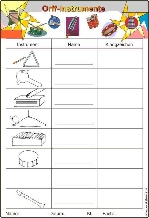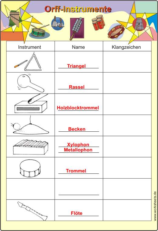 Orff-Instrumente kennen lernen: Aus einer Kiste (einem Regal) mit Orff-Instrumenten holt sich jeder Schüler eines heraus und stellt es später der Klasse vor. Gespräch: Wie klingt es? Welches Zeichen für den Klang malst du an die Tafel? Wie könnte man es nennen? Ergebnissicherung: Arbeitsblatt und Lösungsfolie.