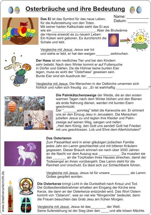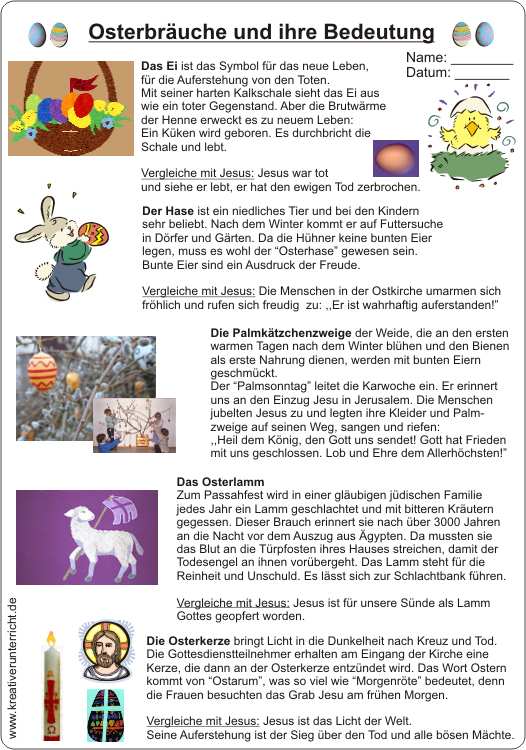 Bedeutung von: Ei, Hase, Palmkätzchenzweige, Osterlamm, Osterkerze, Ostern = Ostarum = Morgenröte