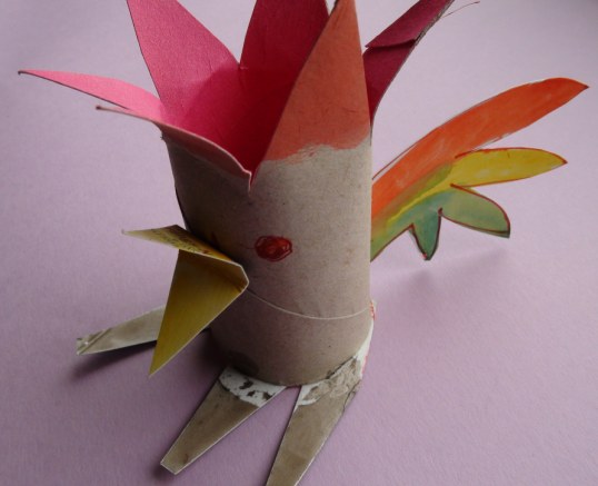 Klorolle oben Spitzen einschneiden und rot anmalen. Füße, Schwanz und Schnabel aus Karton ausschneiden und anmalen. Augen aufmalen.
