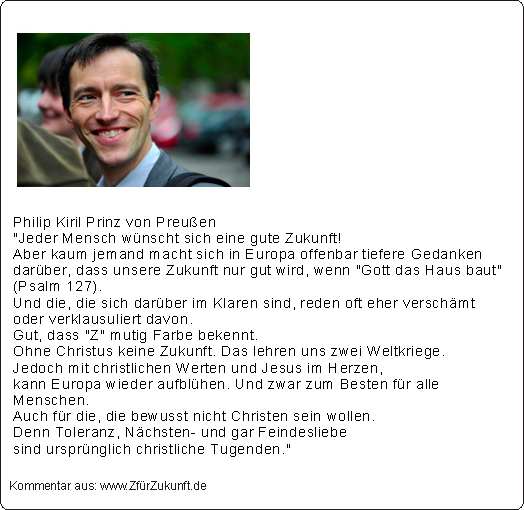 "Jeder Mensch wünscht sich eine gute Zukunft! Aber kaum jemand macht sich in Europa offenbar tiefere Gedanken darüber, dass unsere Zukunft nur gut wird, wenn "Gott das Haus baut" (Psalm 127). Und die, die sich darüber im Klaren sind, reden oft eher verschämt oder verklausuliert davon. Gut, dass "Z" mutig Farbe bekennt. Ohne Christus keine Zukunft. Das lehren uns zwei Weltkriege. Jedoch mit christlichen Werten und Jesus im Herzen, kann Europa wieder aufblühen. Und zwar zum Besten für alle Menschen. Auch für die, die bewusst nicht Christen sein wollen. Denn Toleranz, Nächsten- und gar Feindesliebe sind ursprünglich christliche Tugenden."