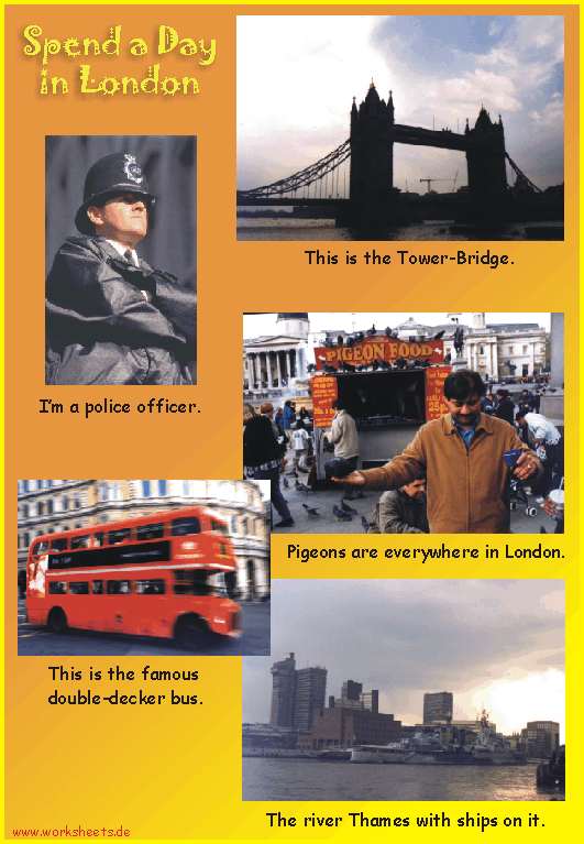 Spend a day in London: Tower-Bridge, Polce Officer, Pigeons, Double-Decker Bus, River Thames;