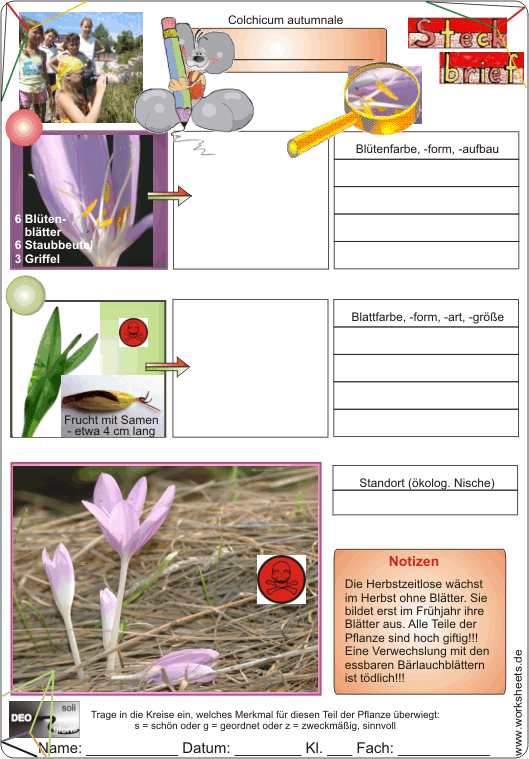 Steckbrief: Herbstzeitlose Colchicum autumnale mit Blüte, Blatt und ökologischer Nische (sie wächst auf Kalkböden in feuchten Wiesen).