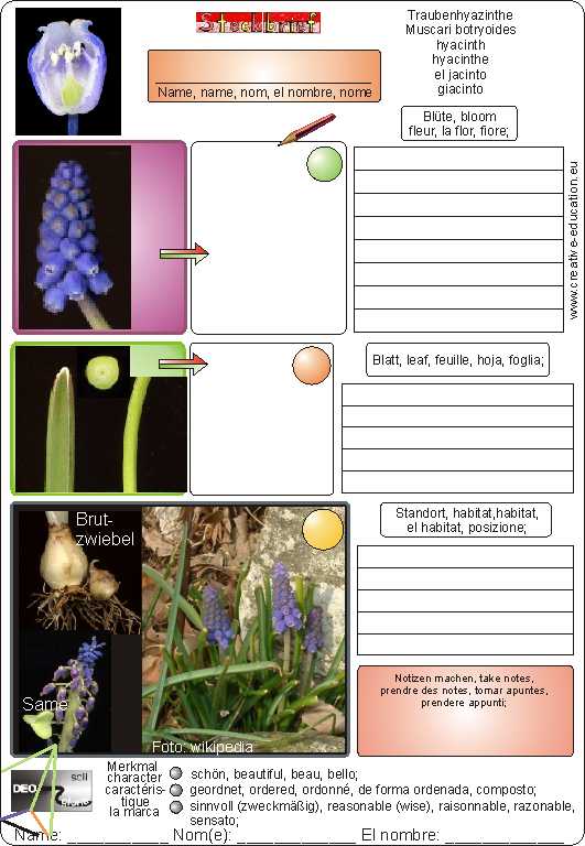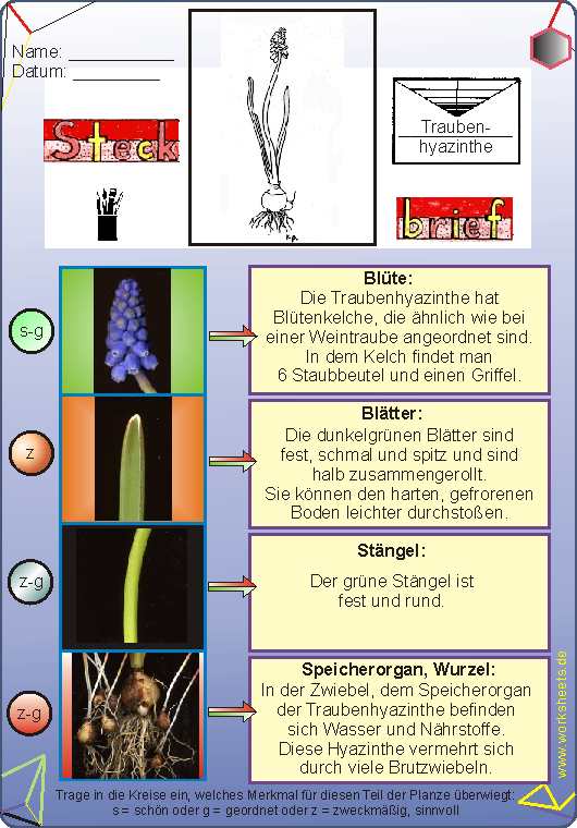 Steckbrief Traubenhyazinthe: Blüte, Blätter, Stängel, Speicherorgan, Wurzel.