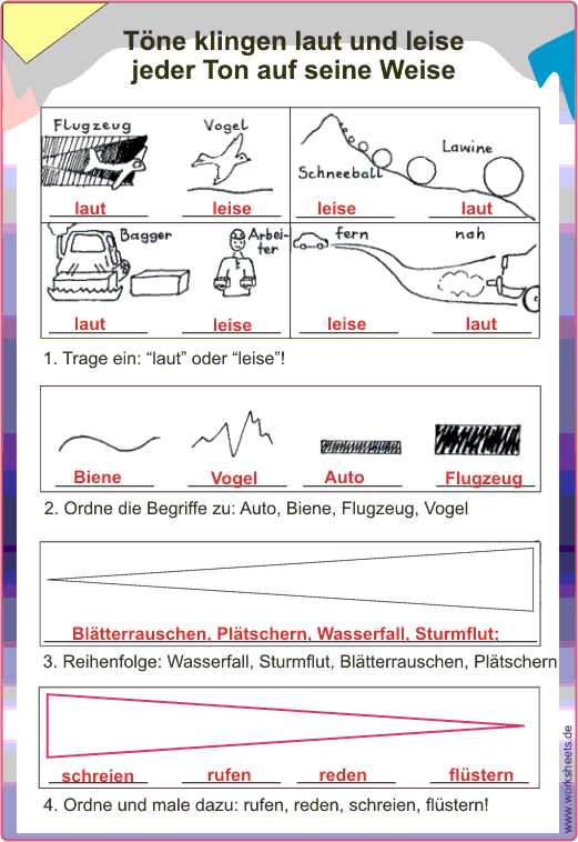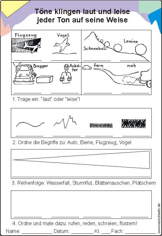 Laute und leise Töne: Als stummen Impuls schreibt der Lehrer auf die linke Tafelseite: Laute Töne und auf die rechte: Leise Töne. Aus ihrem Efahrungsschatz tragen nun die Schüler ihre Beispiele ein. Dann malt der Lehrer ein großes langes Dreieck (siehe AB!) an die Tafel und lässt die Schüler vermuten, was damit gemeint sein könnte. Schließlich finden die Schüler eigene Beispiele für stetiges Lauter- oder Leiserwerden. Das AB kann dann als Lernzielkontrolle eingesetzt werden.
