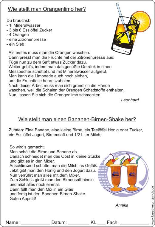 Vorgangsbeschreibung: Wie stellt man Orangenlimo her? Wie stellt man einen Bananen-Birnen-Shake her?
