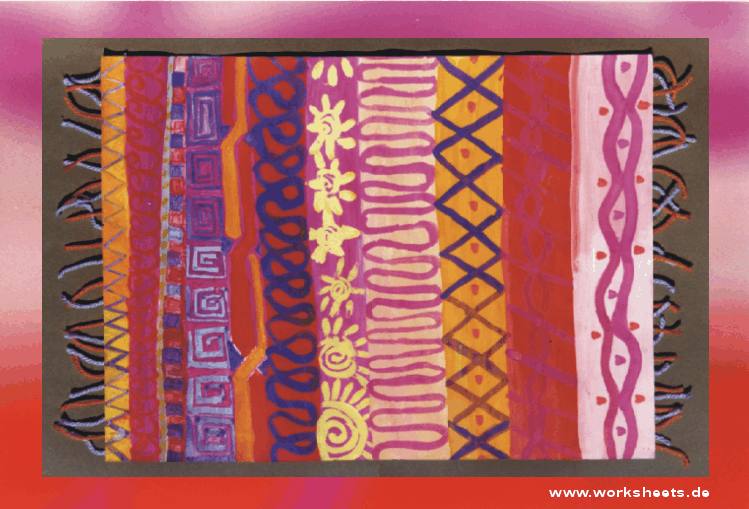 Der Einstieg erfolgte durch eine phatasievolle Geschichte über orientalische Bazars, Teppiche und das Leben der Menschen. Danach bietet sich eine Begriffserklärung “ORNAMENTE” und die praktische Umsetzung in Entwürfe mit Bleistift auf DIN A4 an. Auch die Palette der Rottöne wurde von den Schülern geübt. So entstanden mit Wasserfarben und DIN A3 Zeichenpapier äußerst kreative “Teppiche”, die dann durch farblich passende Fransen aus Wolle eine gut gelungene Komposition abgeben.