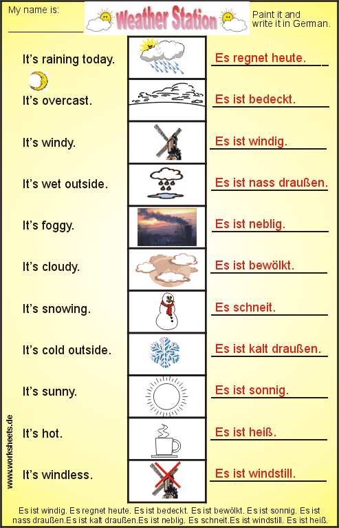 “Wetter Station”, ein Arbeitsblatt für den Schüler, eine Folie für den Lehrer und ein Lösungsblatt zur Lernzielkontrolle. Alle können sowohl von deutschen als auch von Schülern aus England eingesetzt werden.
