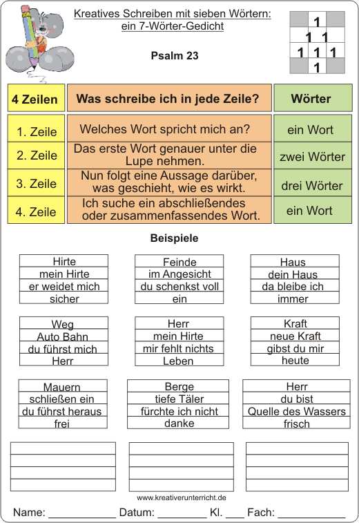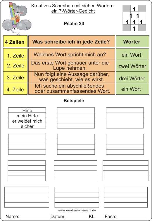 Kreatives Schreiben mit sieben Wörtern: Ein Sieben-Worte-Gedicht zu Psalm 23 mit Anweisungen und Beispielen
